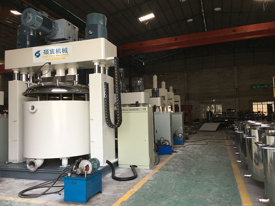 其中強(qiáng)力分散機(jī)(制膠機(jī))是硅酮密封膠、玻璃膠、結(jié)構(gòu)膠的生產(chǎn)設(shè)備中的主要組成部分,也是硅酮膠、玻璃膠的整條生產(chǎn)線中為重要設(shè)備部分。強(qiáng)力分散機(jī)是一種快速攪拌機(jī),有三個(gè)動(dòng)力驅(qū)動(dòng)的電動(dòng)機(jī),釜內(nèi)有三根不同形式、高低速結(jié)合的攪拌器;是一種應(yīng)用行業(yè)廣泛、密封性好、可抽真空、具有良好的脫泡效果、攪拌無死角、高低速結(jié)合、攪拌分散充分快速的混合攪拌設(shè)備。若想要了解更多的工況,您可以提出您所需要的處理量、設(shè)備形式、規(guī)格要求或您需要加工的物料的性質(zhì),根據(jù)您的情況碩宸的銷售工程師會(huì)提供讓您滿意的方案。